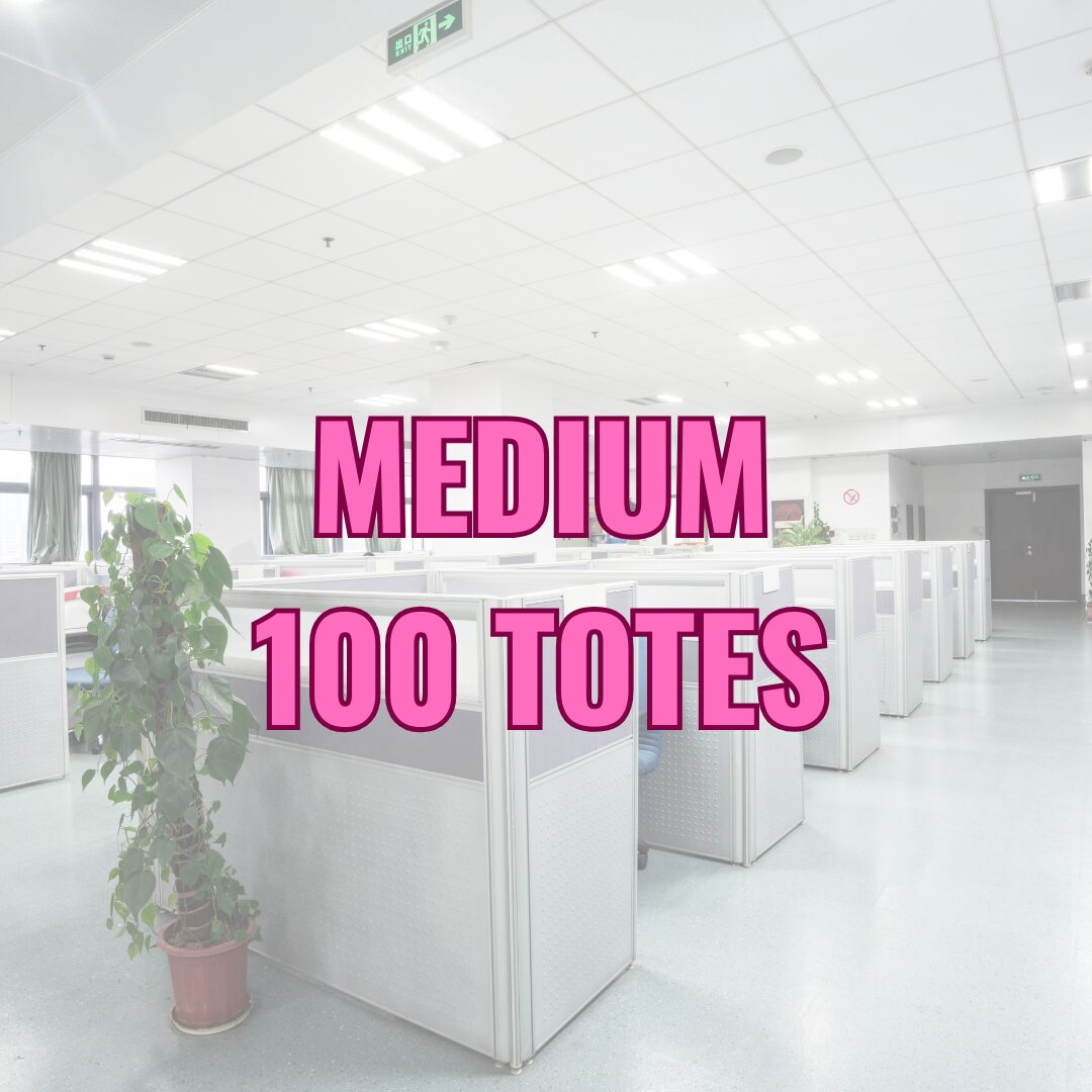 I need a short, friendly product description for my Commercial Package woocommerce product, detailing who this package is meant for, what its benefits are, etc.  This package is meant for a medium sized office for a commercial move, where they will need 100 totes.  They might have around 50 employees as an example. They add on dollies and other services if they wish, and get it delivered to their location.  Make sure to mention "medium" only twice.